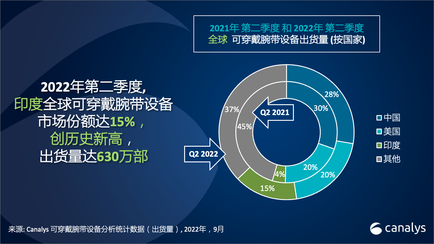 依据Canalys发布的最新统计数据,2022 年第二季度全球可穿戴腕带设备出货量增加 2.0%,到达 4170 万部;在第一季度下降 3.7% 后,再度康复增加。同属腕带手表品类的根底和智能手表,别离增加了 46.6% 和 9.3% 。腕带手表品类持续推进可穿戴腕带设备商场的开展,但是根底手环却在 2022 年第二季度大幅下降了 35.5%。与个人智能音频设备商场相同, 印度的可穿戴腕带设备商场表现是第二季度的一大亮点:在根底手表的推进下,该品类出货量增加了 275%。虽然印度在可穿戴腕带设备的全体出货量方面仍居于我国和美国之后,排名第三,但其商场份额初次到达了 15%。