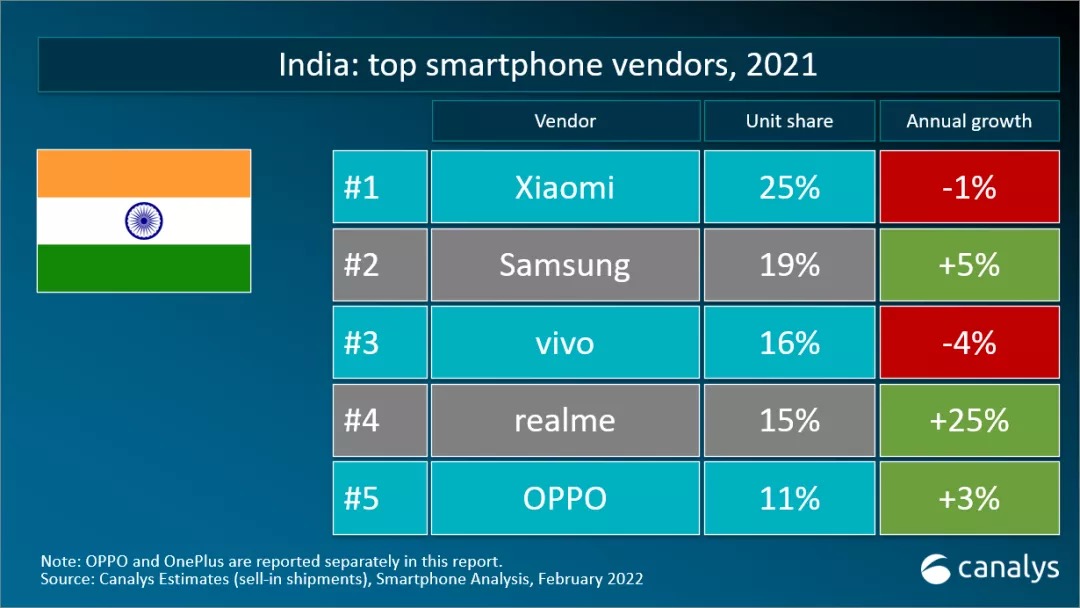 依据Canalys发布的最新数据,2021年第四季度全球智能手机出货量达3.63亿部,同比增加1%。2021全年出货量到达13.5亿部智能手机,同比增加7%,挨近2019年的13.7亿部。其间,三星以近2.75亿部智能手机出货稳坐全球榜首,坚持了20%的商场份额。苹果则在新iPhone系列的推进下,迎来成绩新高,全年出货量到达2.3亿部,同比增加11%,排名第二。小米则以超越1.91亿部智能手机的出货完美收官。OPPO和Vivo以同比增加22%和15%,别离排名第四和第五。