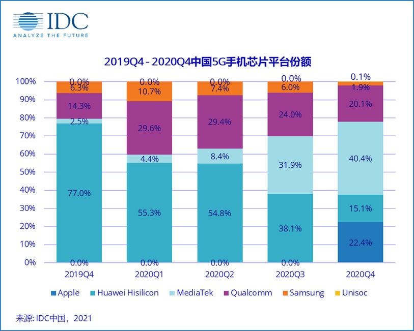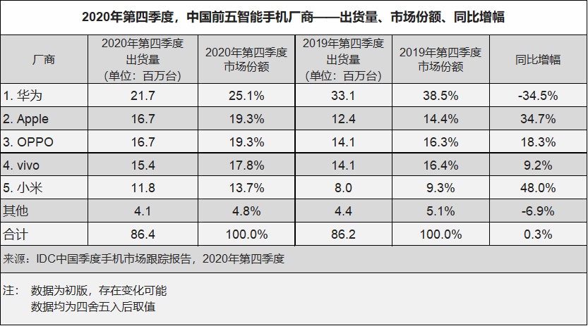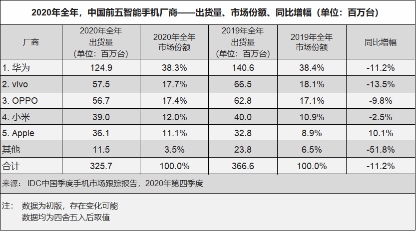 2020 Q4 中国手机市场华为出货量夺冠,全年 5G 手机出货量占比过半