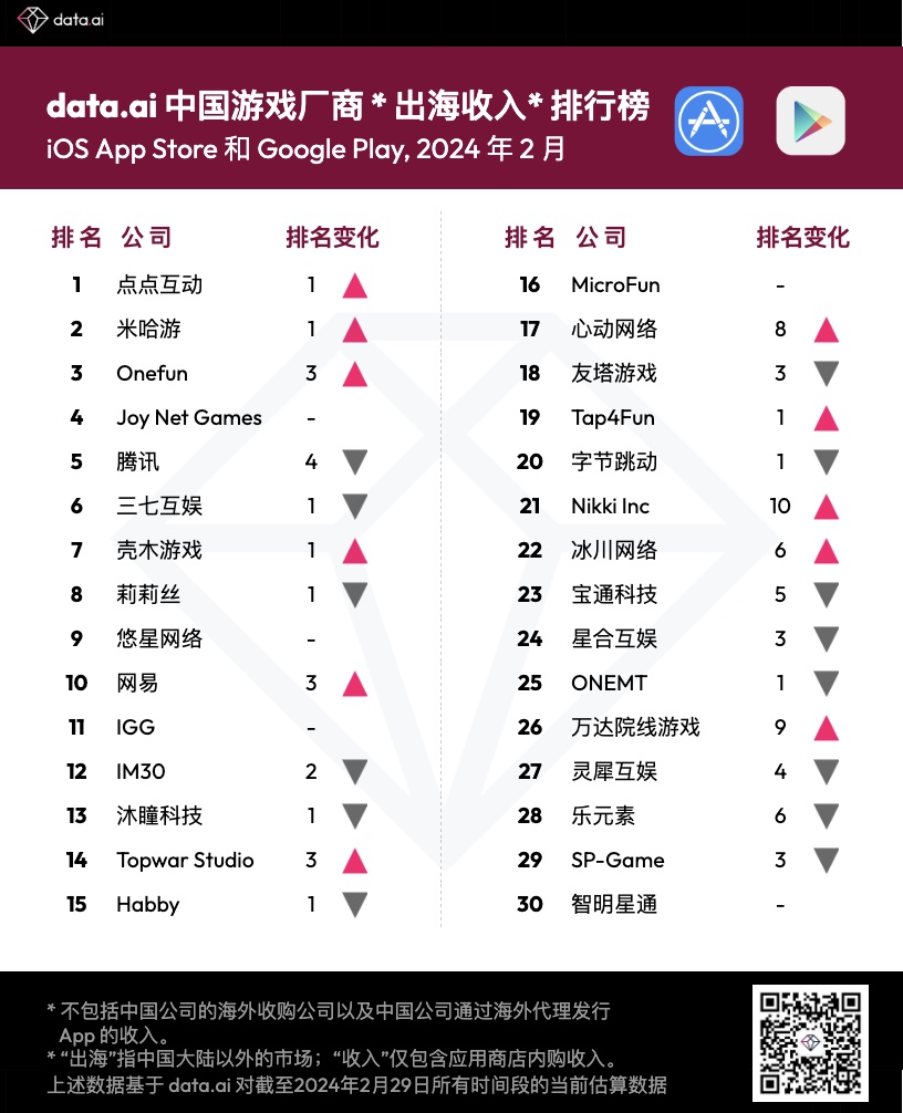 data.ai 发布了 2024 年 2 月我国游戏厂商及使用出海收入 30 强榜单,以下是具体内容: