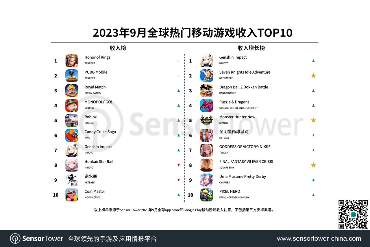 2023 年 9 月全球热门手游收入榜:《王者荣耀》吸金 1.98 亿美元稳夺冠